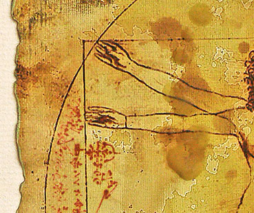The close-ups below illustrate a few examples of my hand work on different prints of the Vitruvian Woman, including pencil, fountain-pen and heat-sensitive ink drawings of sigils and hermetic symbology. Bees-wax, flame and digital texturizing. My own rubber-stamped personal seal. Gold and copper alcohol-based paint, etc. If you are interested please contact me via email for an up to date catalogue of available enhanced prints.